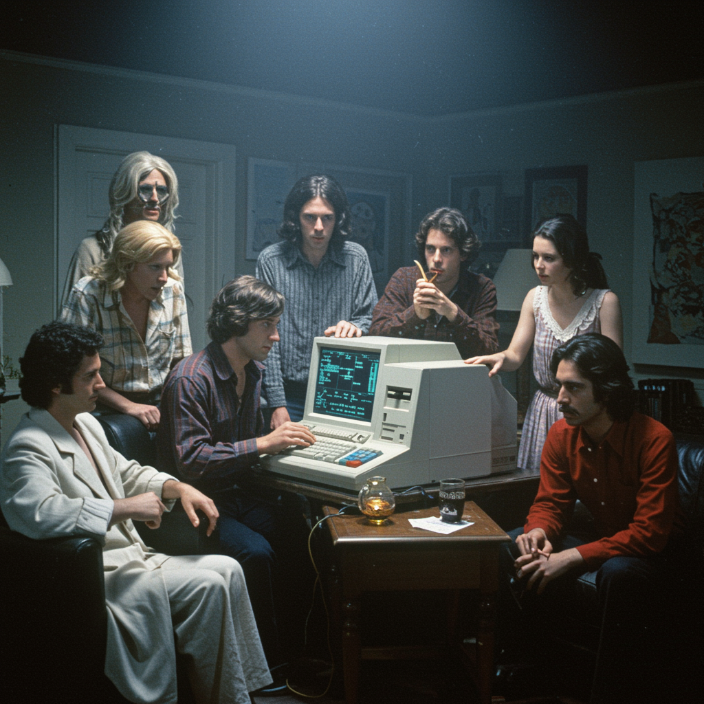 A 1982 DVD screengrab captures a supernatural mystery thriller with an ultra-clear resolution. The scene is steeped in a surreal and ethereal vibe, exuding expressive power and an intriguing composition. A group of diverse humans gathers around a vintage computer, representing AI, in a setting that feels like an esoteric, dreamy living space. The arrangement echoes the style of tarot cards, weaving strange circumstances and unique elements throughout. Each character's story unfolds against a backdrop of low-key cinema lighting, enhancing the dark, cool aesthetics. The environment is highly esoteric and mysterious, drawing viewers in with its ultra-clear resolution. The atmosphere remains cloudless and starless, maintaining its enigmatic ambiance with subtle creative touches that enrich the core concept.