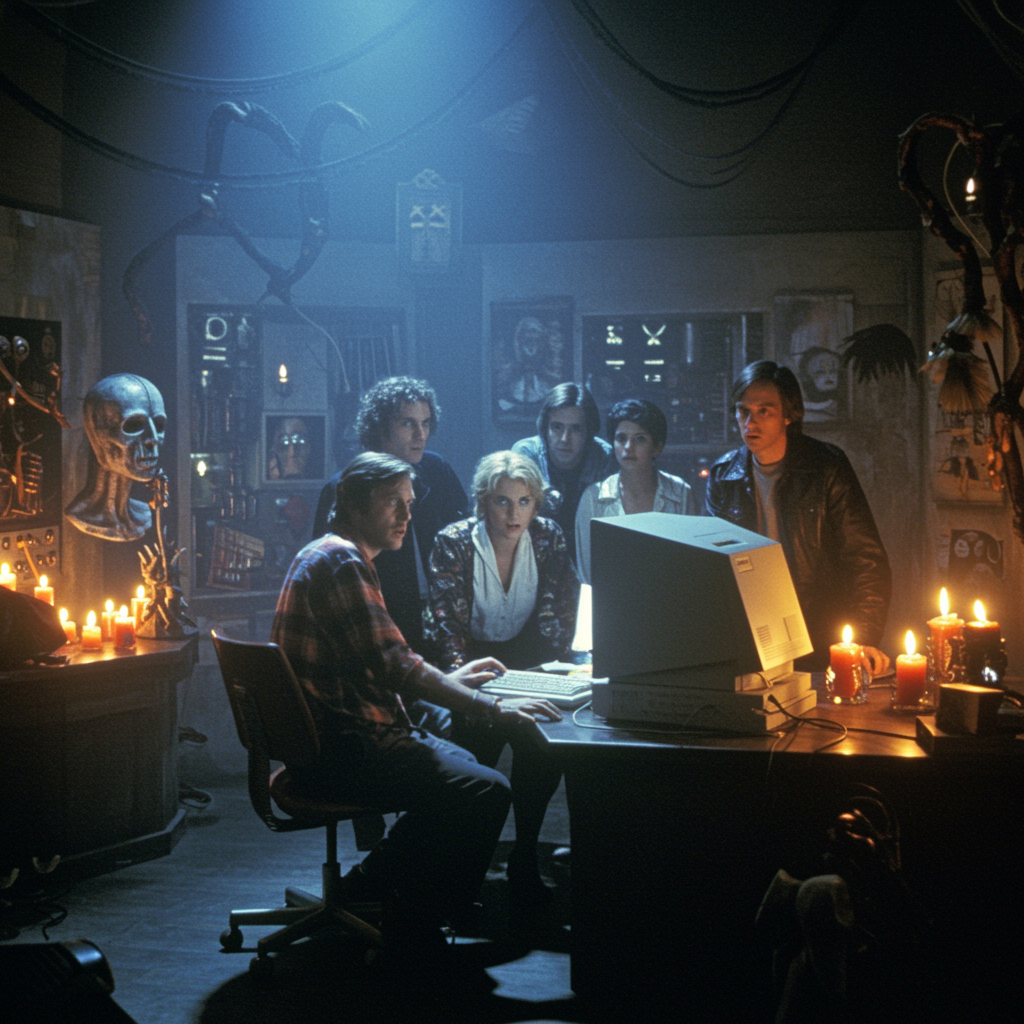 A 1982 DVD screengrab captures a supernatural, mystery thriller scene with an intriguing and ethereal background. The resolution is ultra-clear, showcasing a surreal yet balanced composition filled with expressive power. Set in a dimly lit room, various individuals gather around a computer symbolizing AI, their expressions a blend of awe and trepidation. The setting is esoteric and dreamlike, reminiscent of a Tarot card tableau. Strange symbols and unique elements pepper the room, adding to the air of mystery. The lighting is low-key, casting deep shadows that enhance the dark, cool aesthetic. This enigmatic tableau exudes an esoteric and mysterious vibe, with an ultra-clear resolution that draws you into its enigmatic narrative.