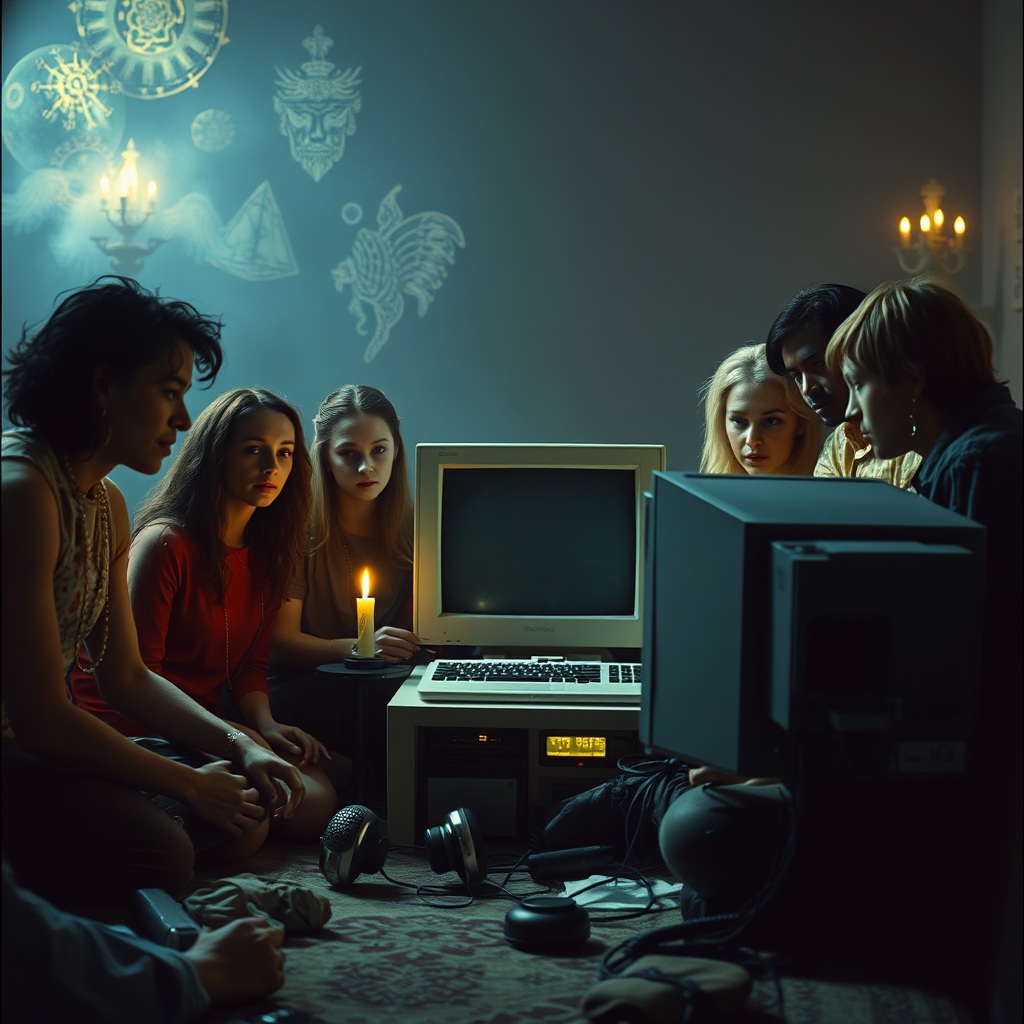 A 1982 DVD screengrab of a supernatural mystery thriller featuring a captivating background with ultra-clear resolution. The scene showcases a surreal and ethereal vibe with expressive power and intriguing composition. A group of diverse individuals is gathered around a computer symbolizing AI, evoking strange and unique circumstances. Their gathering suggests an esoteric and dreamy living situation with elements reminiscent of tarot card style. The low-key lighting and dark, cool aesthetic accentuate the highly esoteric and mysterious atmosphere. The unique elements and storytelling are richly detailed, maintaining an ultra-clear resolution and a compelling narrative feel.