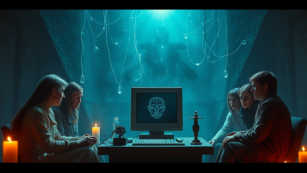 A 1982 film frame captures a supernatural mystery thriller with an intriguing background, offering ultra-clear resolution and a strong, balanced composition with a surreal and ethereal atmosphere. The setting is marked by strange circumstances and unique elements as a diverse group of individuals gathers around a computer symbolizing AI. This esoteric and dreamy living scenario is depicted in a style reminiscent of tarot cards. The scene exudes a low-key cinematic light with a dark, cool aesthetic, emphasizing a highly mysterious and esoteric vibe. The characters' stories unfold against this backdrop, with a focus on maintaining the ultra-clear resolution and expressive power of the moment. The composition invites creative elements while preserving the core enigmatic concept.
