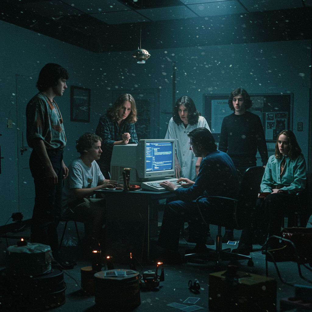 A 1982-inspired DVD screengrab of a supernatural mystery thriller, featuring an interesting background with ultra-clear resolution. The scene balances surreal and ethereal elements with expressive power and an intriguing composition. In this unique setting, a group of diverse individuals gathers around a computer symbolizing AI, set in a dreamlike and esoteric atmosphere reminiscent of tarot card art. The stories of these characters unfold within an environment rich in low-key lighting and cinematic aesthetics, evoking a dark and cool mystery with no clouds or stars in sight. The image captures a highly enigmatic and mystical vibe, presented with an ultra-clear resolution and raw style, complete with small creative modifications that enhance its unique essence.