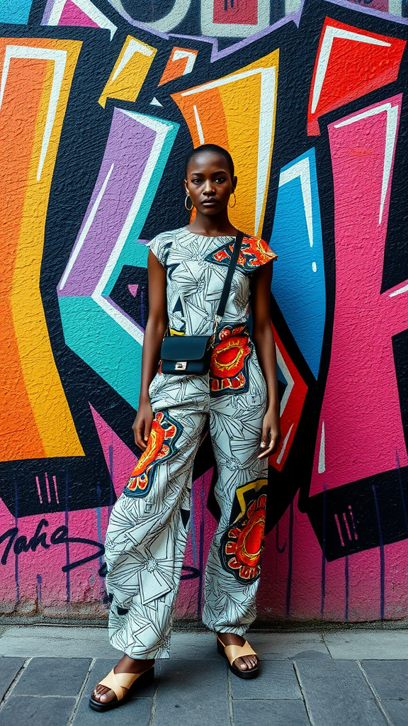 A 1990s street photographer in Santiago captures a poised model standing against a vivid mural of abstract graffiti crafted from bold, angular shapes and vibrant hues. The model's outfit seamlessly merges with the colorful urban art, showcasing intricate patterns reminiscent of Tokyo Fashion Week, blending the essence of avant-garde style with street-edge flair.