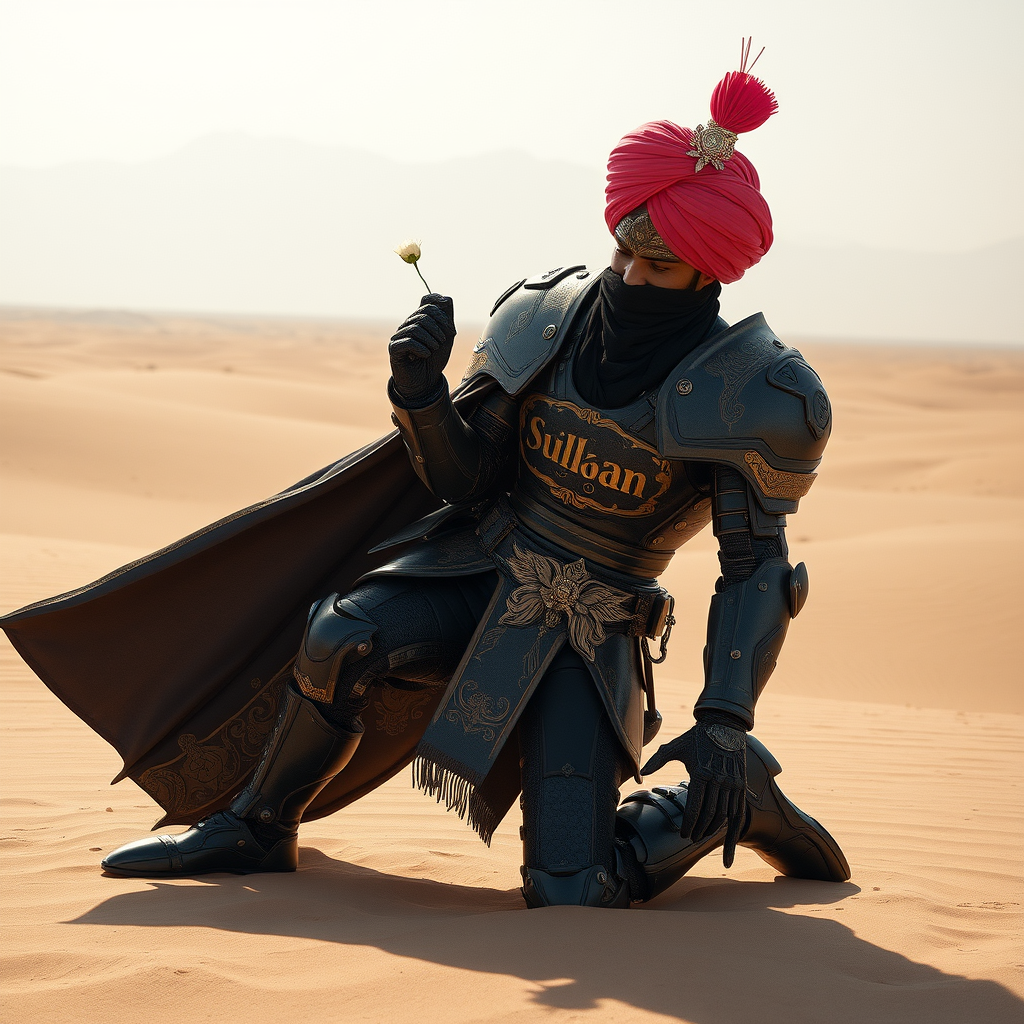 A 19th-century Sikh king adorned with a vibrant turban and encased in a majestic Japanese mecha exoskeleton reminiscent of a Gundam warhammer, accented by an intricate long heavy cape that billows with the gentle desert breeze. The sleek carbon fiber suit is exquisitely engraved with luminous gold Punjabi script, bestowing an aura of mystical powers. In the style reminiscent of Billelis, his face is cloaked with an ornate metal cover. Positioned centrally, the king kneels gracefully in the vast expanse of a barren desert, reaching tenderly to pick a delicate flower, symbolizing a poignant intersection of strength and tranquility. The brilliant armor showcases neo-futuristic technology, presenting a harmonious blend of modern history and futuristic wonders. The desert's endless backdrop basks in serene daylight, bathed in natural lighting, with nuanced details that echo the visionary artistry of Akira and Star Wars. The scene captures the essence of Norman Rockwell, Syd Mead, Boris Vallejo, Jean Giraud Moebius, John Berkey, Eugéne Delacroix, and Rembrandt Van Rijn, illustrating a romanticized saga filled with subtle, blink-and-you-miss intricacies.