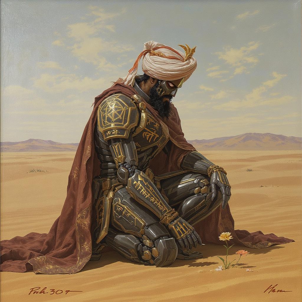 A 19th-century Sikh king wearing an intricately designed turban combines tradition with advanced modernity, donning a Japanese mecha exoskeleton gundam suit with warhammer aesthetics. The suit, made of sleek carbon fiber, is adorned with gold-engraved Punjabi script that bestows mystical powers upon the wearer. He is cloaked in a long, heavy cape, and parts of his face are concealed by a meticulously crafted metallic mask. The scene captures him at the center, in a kneeling pose as he delicately picks up a lone flower from the desolate desert floor. The armor epitomizes neo-futuristic technology that bridges eras, while the endless desert landscape stretches under natural daylight, evoking a sense of romantic isolation. The artwork's style is a seamless blend of influences from Akira and Star Wars, with a nod to the legendary cinematic storytelling of Akira Kurosawa. This scene, painted with painstaking precision, showcases the artistry of Norman Rockwell, Syd Mead, Boris Vallejo, Jean Giraud Moebius, John Berkey, Eugène Delacroix, and Rembrandt Van Rijn, capturing every blink-and-you’ll-miss detail, enveloping the viewer in a timelessly serene yet powerful tableau.