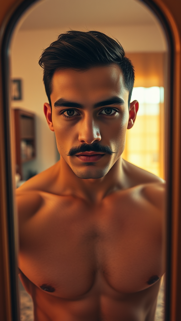 A 20-year-old, athletic Persian Iranian wrestler with a chiseled physique, strikingly handsome featuring a distinctive mustache. Captured in a hyper-realistic full-body shot, this image highlights his flawless pupils and eyes, emphasizing perfect human anatomy. Taken with an iPhone 14 in a mirror, the setting is a cozy, brightly-lit room with a warm, inviting atmosphere. He has short, dark hair, and the composition is enhanced by a subtle film grain, reminiscent of Kodak Portra 800. Shot at f1.8 during the golden hour, the scene glows with an ethereal quality, giving a vintage yet contemporary feel.