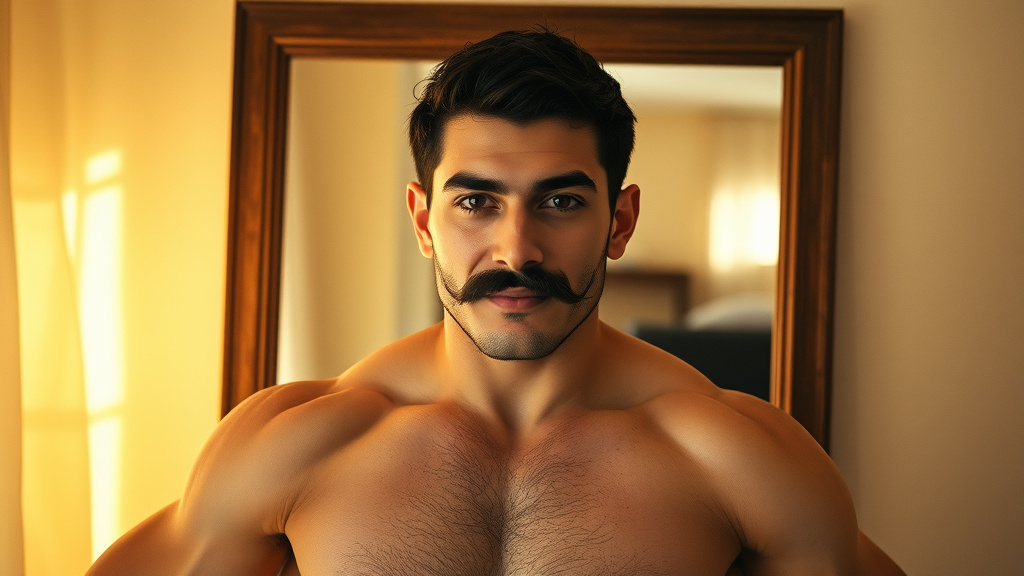 A 20-year-old muscular Persian Iranian wrestler with striking features stands confidently in front of a mirror, showcasing a proud mustache and handsome visage. His well-defined physique is captured in a hyper-realistic full-body shot, emphasizing his perfect human anatomy. His eyes, set with perfect pupils, exude contentment and determination. The scene is captured on an iPhone 14, set in a cozy, bright room during golden hour, which casts a warm glow over his short dark hair. A subtle touch of film grain reminiscent of Kodak Portra 800 adds a nostalgic ambiance, while the image is captured at f1.8, enhancing the depth and softness around him.