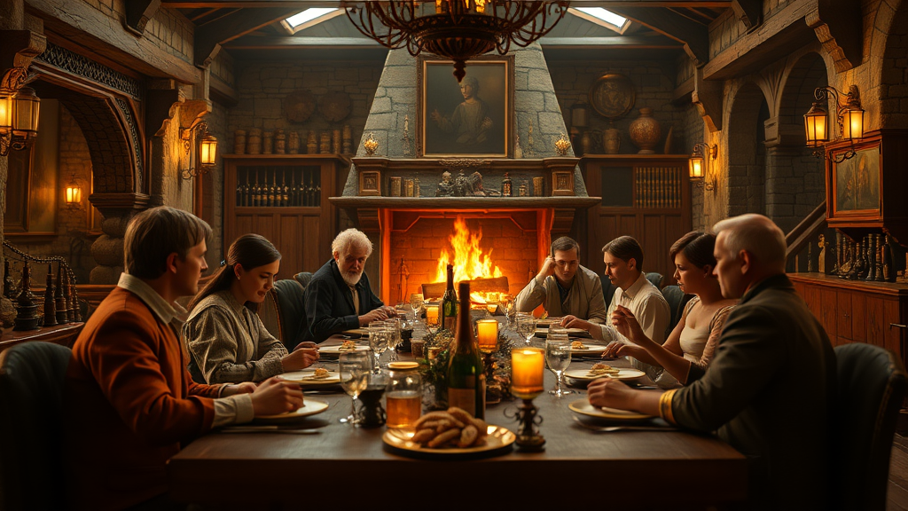 A 200mm lens captures a cinematic shot, embodying award-winning CGI with the perfect angle as subjects sit sharing a meal, evoking a "last supper" feel. The scene is cozy yet surreal, with an epic composition set against a highly detailed medieval bar interior, complete with a roaring fireplace. The image features hard focus with smooth raytracing, specular lighting, and depth of field, enhanced by volumetric lighting and reflections from octane rendering techniques. The 3D render achieves HD to UHD levels, aspiring to 64K and 128K resolutions, delivering a masterpiece of professional quality. The environment is devoid of errors or artifacts, ensuring high fidelity in every aspect. The warm ambiance and detailed textures contribute to a captivating and immersive atmosphere, inviting exploration while maintaining visual harmony and storytelling depth.