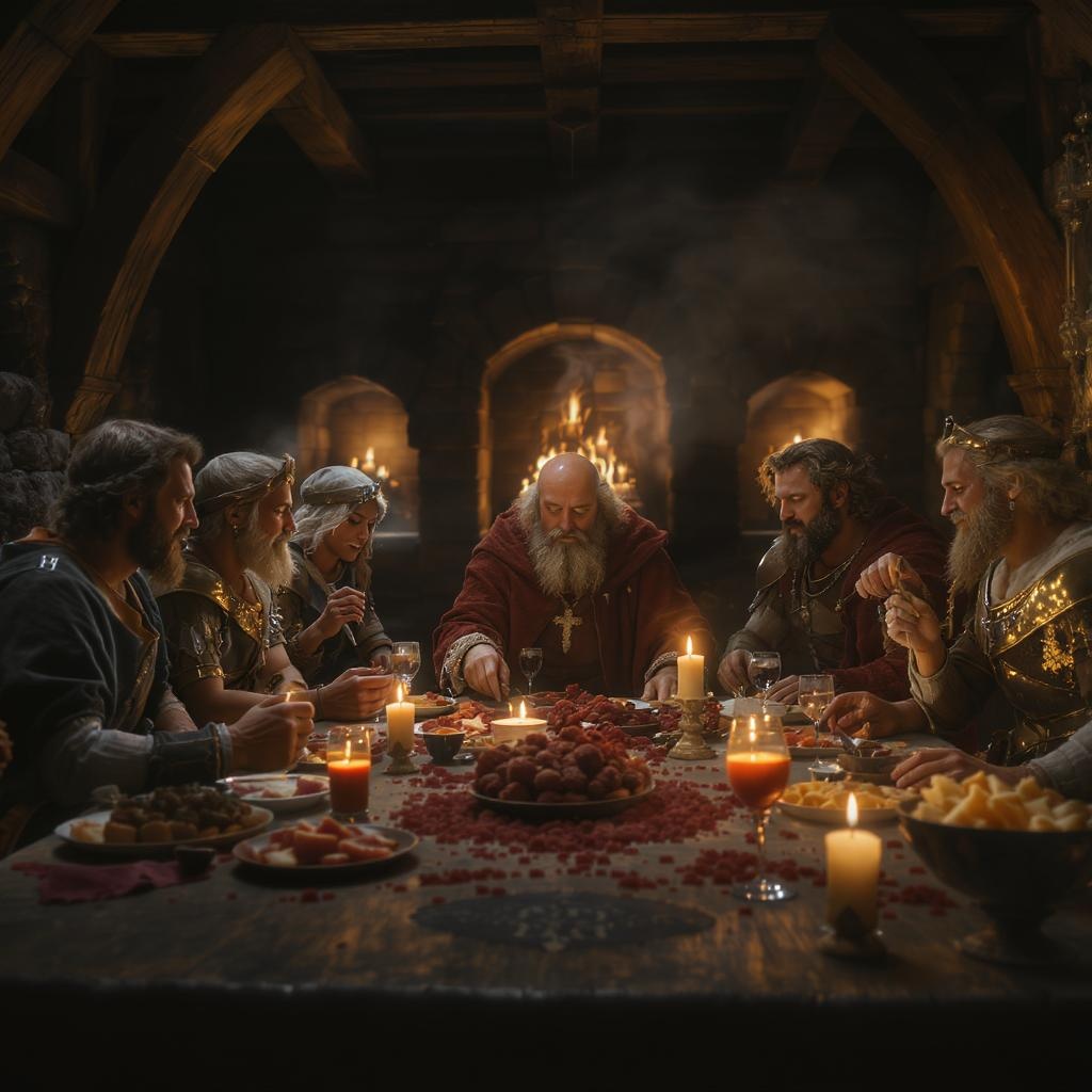 A 200mm lens captures a cinematic shot of an award-winning CGI scene. The scene features a perfect angle highlighting a group sitting together, enjoying a meal reminiscent of the Last Supper, set in a cozy and surreal atmosphere. The composition is epic, with a detailed medieval bar interior as the background, complete with a warm fireplace. The focus is sharp and the textures smooth, enhanced by raytracing, specular lighting, and depth of field. Volumetric lighting casts realistic reflections, bringing the scene to life through an octane render. This 3D masterpiece is rendered in HD, UHD, 64K, and even 128K, showcasing professional work of the highest quality.