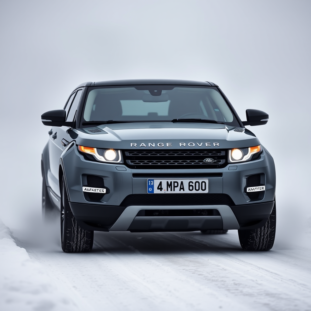 A 2012 model, single-door, grey Range Rover Evoque with license plate 34 MDA 600 glides down a snowy road, its headlights piercing through the dense fog. The car's polished exterior gleams with high brightness under an eerie atmosphere. The scene is shrouded in mystery, with swirling mists enhancing the uncanny mood. The setting evokes a sense of hygge, where the warmth of the vehicle contrasts with the cold, ghostly environment outside, reminiscent of an Artgerm illustration. Despite the chilling surroundings, there's an inviting coziness inside the robust, modified SUV as it navigates the winter landscape.