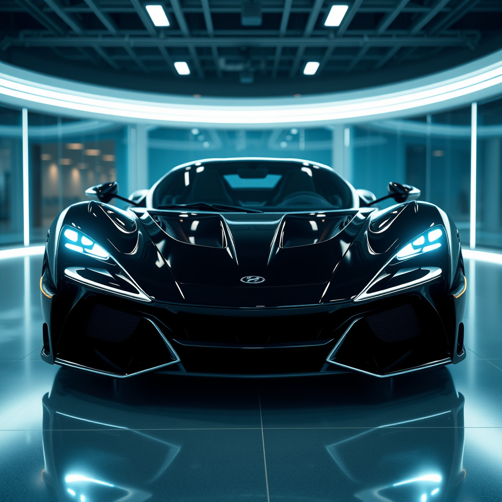 A 2023 cutting-edge supercar with an elegant black exterior and sleek silver trim showcased under bright showroom lights, capturing the breathtaking front view of this automotive marvel. The scene is rendered using Unreal Engine 5, achieving a photorealistic image with stunning 8k, 16k, 4k, and HD resolution. With advanced ray tracing, the reflections and details of the car are captured at a hyper-realistic level, offering a captivating visual experience even at 1080p. The glossy finish and dynamic curves of the supercar are accentuated by the ultra-modern showroom environment, featuring subtle creative touches like innovative LED highlights and an aerodynamic design that hints at its tremendous performance capabilities.