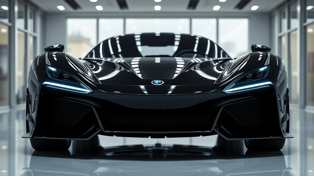 A 2023 luxury supercar with a sleek black body and sophisticated silver trim is showcased from the front in a modern showroom setting. The gleaming showroom lights highlight the car's aerodynamic design and flawless finish, captured with Unreal Engine 5 technology. Thanks to its photorealistic rendering, the image boasts an unparalleled level of detail in 8k, 16k, and 4k HD resolution, enhanced further by the stunning ray tracing effects. The smooth reflections on the car's chassis and chrome wheels provide a hyper-realistic perspective. The scene's vividness and precision remain consistent in 1080p quality, showcasing the full potential of Unreal Engine 4k capabilities, while slightly accentuating the car's contoured hood and innovative headlight design for an extra touch of modern artistry.
