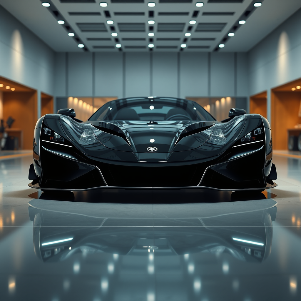 A 2023 supercar with a sleek black body and elegant silver trim, prominently displayed in a high-end showroom. From the front view, the car's aerodynamic design is illuminated by state-of-the-art showroom lighting, highlighting its glossy finish and contours. Utilizing Unreal Engine 5 technologies, the setting achieves a photorealistic quality, with incredibly detailed 16k, 8k, and 4k resolution options. The hyper-realistic scene employs advanced ray tracing techniques, creating stunning reflections off the car's polished surfaces. The hyper-realistic level of detail ensures an ultra-clear 1080p resolution, showcasing the supercar's bold design and the showroom's sophisticated ambiance.