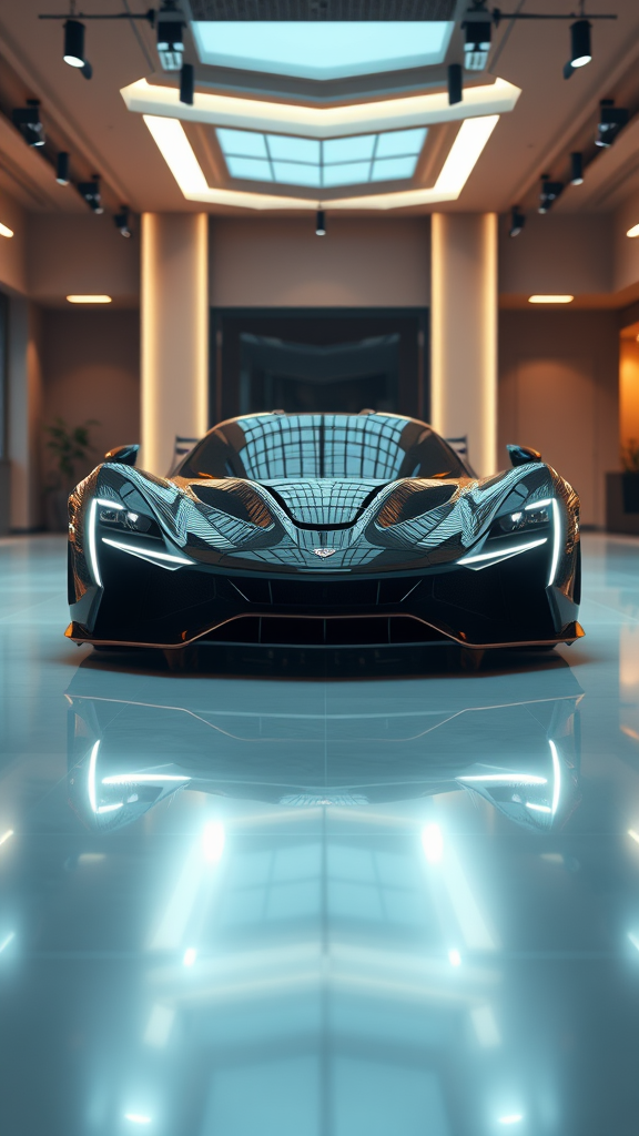 A 2023 supercar with sleek black and silver trim takes center stage in a sophisticated showroom setting, bathed in elegant showroom lights. Captured from the front view, the car exhibits incredible detail created using Unreal Engine 5. The image boasts photorealistic quality at 8k, 16k, 4k, and HD resolutions, enhanced with Unreal Engine 4k's cutting-edge technology. The use of ray tracing enriches the scene, producing exquisite reflections across the car's polished surface. The hyper-realistic level captures every nuance, rendering it in stunning 1080p clarity, adding visual depth and allure to the setting.