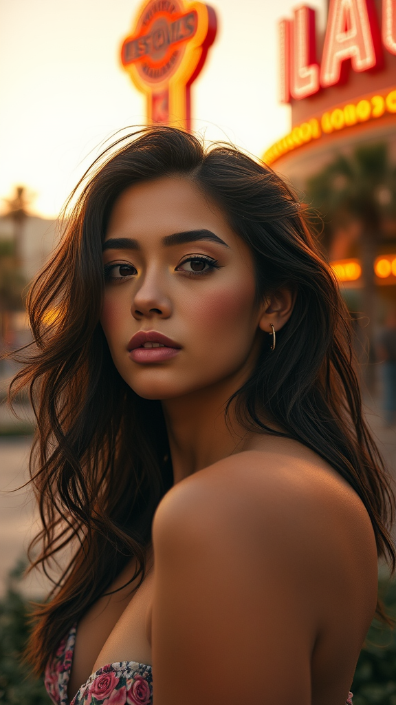A 21-year-old woman, intricately detailed and high-quality, depicted in a dramatic, ray-traced photograph set in an Ornate Tropical Las Vegas at golden hour. The image is ultrarealistic with elements of Queercore Art and broad lighting, featuring a soft film grain and captured with a film camera using a circular polarizer. A sepia filter overlays the Instagram-ready UHD shot, blending the essence of a dslr 3d photograph with artistic elements. The scene incorporates drawings and abstract art, interwoven with cartoon and surrealist painting touches, alongside conceptual drawing and graphics. A creative collage with references to letter art and implied nudity adds depth while maintaining a tasteful and intriguing narrative.
