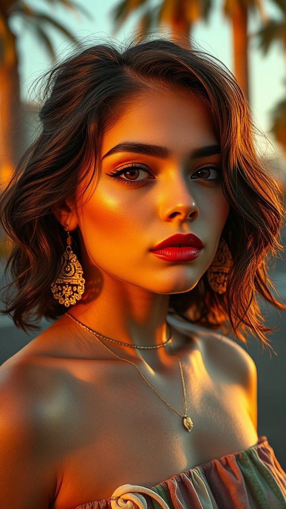 A 21-year-old woman, intricately detailed, captured in high-quality ultrarealistic image at golden hour in Ornate Tropical Las Vegas. The scene features dramatic lighting enhanced through ray tracing, with broad lighting that highlights nuanced textures. The atmosphere is influenced by Queercore Art, blending elements of film grain and sepia tones, reminiscent of a vintage Instagram aesthetic. The image has been expertly shot with a DSLR using a circular polarizer, achieving UHD clarity. The composition creatively integrates aspects of abstract art, cartoons, surrealist painting, and conceptual drawing, culminating in a vibrant collage of graphics and surreal elements. The photograph subtly balances a mix of elegance and artistic expression.