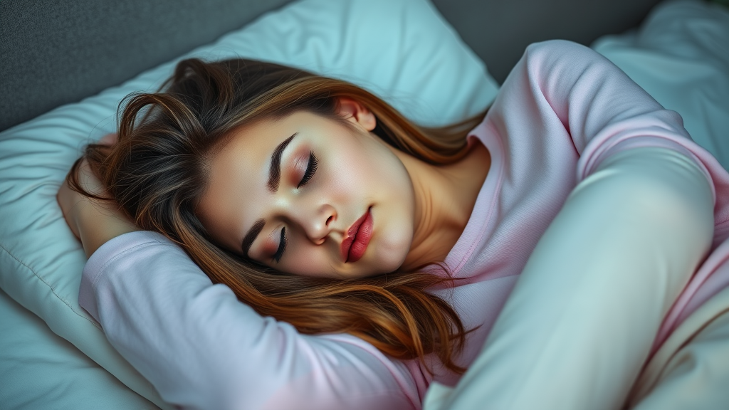 A 22-year-old woman peacefully sleeping, dressed in comfortable pink pajamas with a cozy long-sleeve top, her long brown hair slightly tousled across the pillow, creating a tranquil and serene ambiance around her.