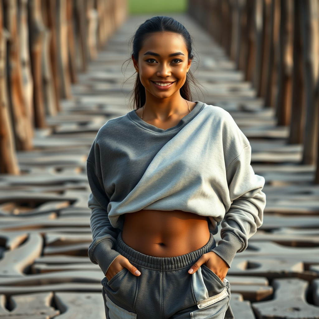 A 24-year-old Cree-Kanak female dancer exudes playful energy and a sense of victorious elation. Her body is defined with smooth collarbones tapering into strong shoulders, highlighted by her toned muscles and flat chest with small breasts. Her deep, rich brown skin features cool undertones and an even, smooth texture with visible pores and details in focus. She gazes with thin crescent eyes of calm, muted green, framed by long, elegant eyelashes. Her delicate facial features are complemented by mini-arch shaped eyebrows. She wears an overly large asymmetrical sweatshirt and paneled harem pants with abstract cuts that showcase her midriff. Her hands are casually in pockets, with a slight, confident smile lighting her face. The scene employs the rule of thirds with a backdrop featuring disjointed wooden planks forming a pathway, inspired by an unknown work of H. R. Giger, adding a surreal and artistic touch.