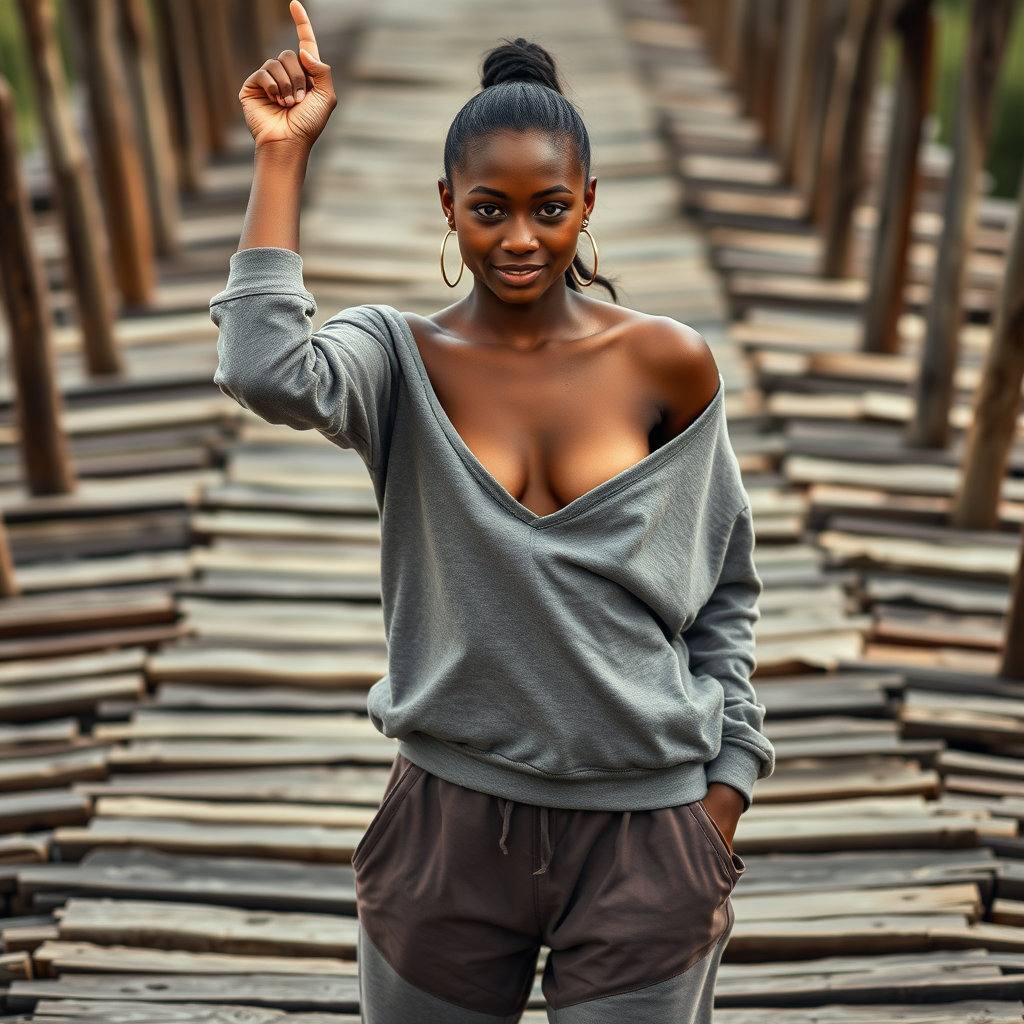 A 24-year-old Cree-Kanak female playful dancer exudes victorious elation with her prominent, smooth collarbones tapering into defined shoulders and a toned physique, including abs and a flat chest. Her deep, rich brown skin with cool undertones is smooth and even, with visible pores and texture in focus. She has thin crescent eyes with calm, muted green hues, elegantly framed by long eyelashes. Her eyebrows are mini-arched, complementing her delicate facial features. She wears an overly large, asymmetrical sweatshirt exposing her midriff, paired with paneled harem pants featuring abstract cuts. With hands in pockets and a slight smile, she embodies the rule of thirds. Disjointed wooden planks form a pathway in the background, reminiscent of the enigmatic style of H. R. Giger, adding a unique twist to the setting.