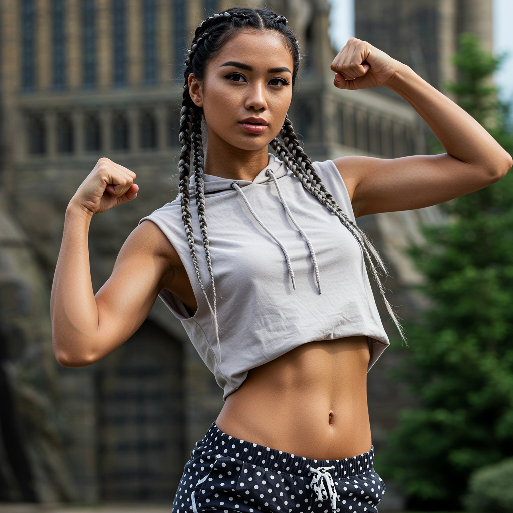 A 24-year-old Kazakh-Hungarian female CEO exudes confidence with a challenging head tilt, her face the focus of this close-up shot. Her body, with a visible ribcage and smooth, defined muscles, shows toned abs and a flat chest. Her golden brown skin, glowing naturally after a day in the sun, reveals clear pores and texture sharply in focus. Large, pill-shaped honey eyes framed by long, elegant lashes draw attention, while metallic silver Dutch braids crown her head. Her sculpted brows perfectly complement her delicate facial features. She wears a sleeveless hoodie and polka dot shorts, her midriff exposed, and strikes a victorious pose. Positioned on the left side of the frame by the rule of thirds, she stands against the grand backdrop of Hogwarts' Great Hall. Soft natural lighting in the style of Paulina Olszynski bathes her, enriched by creative elements that enhance her striking appearance.