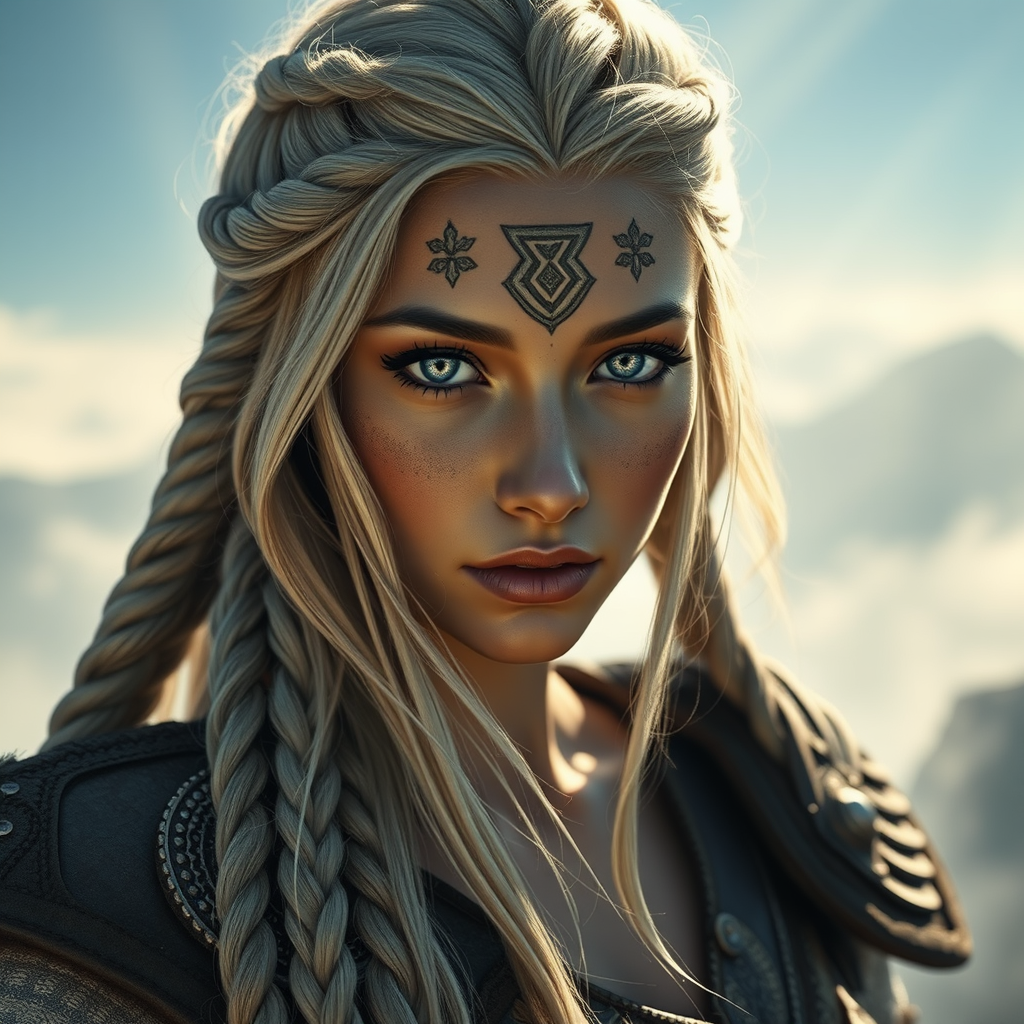A 25-year-old blonde war princess stands with a captivating gaze and an alluring expression, her long braided hair flowing elegantly. She's adorned with cultural face paint and cloth armor, exuding an intricate and elegant aura within an urban fantasy setting. Her bright grey eyes are extraordinarily detailed, reflecting an ultra-realistic symmetry that is mirrored in the backdrop—a foggy mountain view. A cinematic 1980s film still atmosphere pervades, reminiscent of a 35mm Kodak Portra 800 image, with grain and a matte finish enhancing the scene's analog charm. Radiant light rays create a magical ambiance, illuminating dust in the beams and casting heavenly, moody shadows. The artwork showcases detailed facial features and meticulously realistic skin texture and clothes, achieving a photorealism with max detail and sharp focus. High-res digital painting techniques blend with cinematic effects, using octane render and unreal engine 5 shaders for ambient occlusion and tone mapping, evoking a light, exciting, and enlightening mood. The image employs exquisite backlighting and dynamic lighting aesthetics, avoiding imperfections with an emphasis on naturalism and realism.