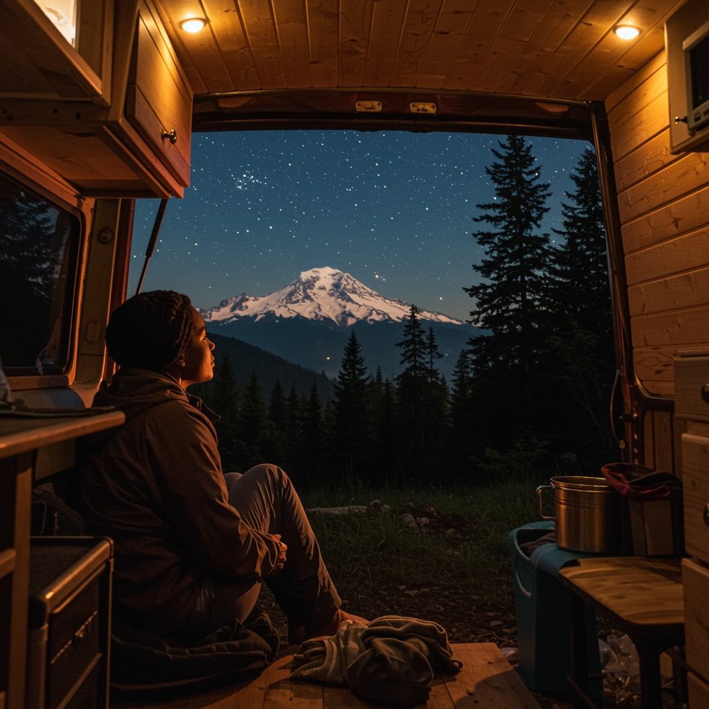 A 30-year-old black woman sits quietly in the back of her van, her gaze fixed on the breathtaking Olympic mountain range illuminated by the starlit sky. The serene sounds of the forest pervade the air, and she experiences a blend of awe and uncertainty about her journey. The gentle crackling of her campfire is interrupted by a chilling gust of wind, reminding her of the solitude she faces in the wilderness. Taking a deep breath, she contemplates her supplies, pondering what discoveries and challenges await her. As she reflects on her journey and the decisions that led her here, the van becomes a symbol of freedom and self-discovery. This moment is captured beautifully, ideal for trending on Instagram, encapsulating the essence of van life exploration.