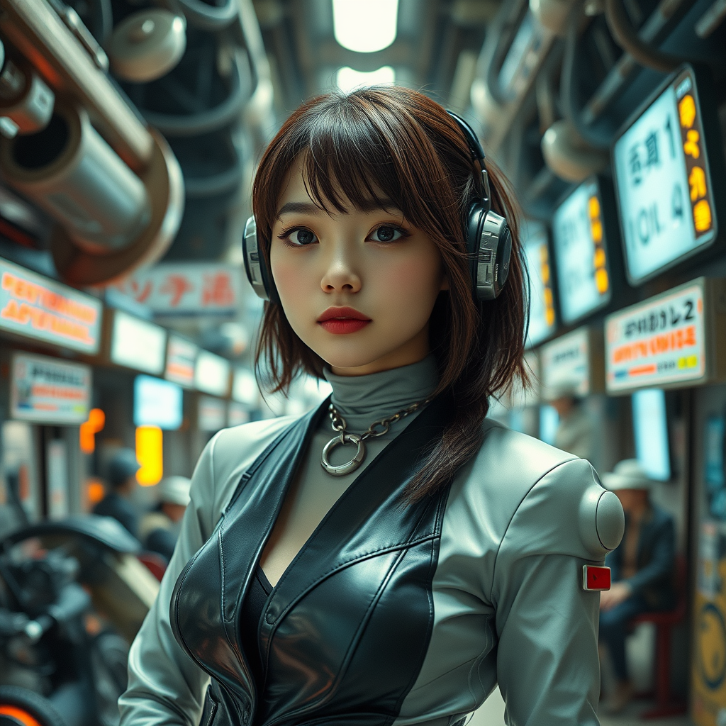 A 30-year-old Japanese beauty in an atompunk setting, depicted in a full-body image from a high angle shot. The composition is centered, featuring epic level detail with a cinematic quality. She's surrounded by futuristic elements, blending advanced technology with mid-20th century aesthetics. Her attire is modern and sleek, avoiding traditional garments, fitting seamlessly into the atompunk universe. The setting is vibrant and intricate, with a background that hints at a world where retro-futurism is the norm.