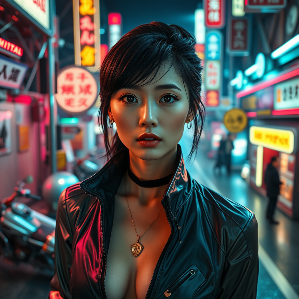 A 30-year-old Japanese woman with striking beauty, set in an atompunk world, captured in a full body cinematic shot from a high angle with the composition centered. She is surrounded by a retro-futuristic landscape filled with neon lights and chrome structures, wearing sleek, futuristic attire that complements her elegant yet powerful presence. Her hair is styled in a modern twist, subtly reflecting the era's fusion of tradition and technology. The scene's details are rich and epic, showcasing textures and reflections that highlight the atompunk theme, maintaining a sense of grace and sophistication.
