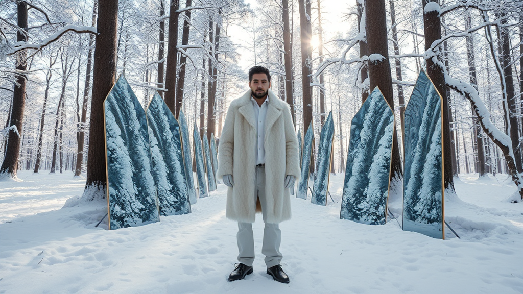 A 30-year-old man of average height, standing at 5'8", finds himself in a tranquil forest blanketed with snow, surrounded by towering trees shrouded in white. The ground glistens with fresh snowfall, and the air feels crisp and silent. Strategically placed large mirrors encircle him, capturing his reflection from every angle and crafting a surreal and enchanting ambiance. He is clad in a sumptuous white fur coat and matching trousers, seamlessly blending with the snowy landscape. Gentle sunlight pierces through the branches, casting a soft, luminous glow on the scene, accentuating the ethereal beauty of the winter wonderland.