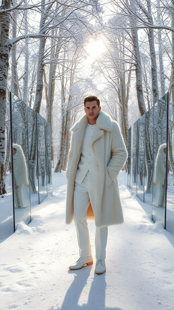 A 30-year-old man of average height stands amidst a tranquil forest carpeted in snow, with towering trees draped in pristine white. The snow-covered ground sparkles under the gentle light, and the air is crisp and silent. Surrounding him, an array of large mirrors captures his reflection from multiple angles, adding a dreamlike and mystical quality to the scene. He is dressed in an opulent coat of white faux fur that flows down to his knees, paired with elegant white trousers that seamlessly blend with the wintry landscape. The soft rays of sunlight weave through the branches, casting a warm glow and highlighting the serene beauty of the winter scene.