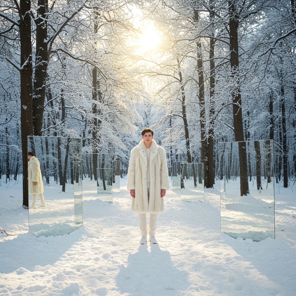 A 30-year-old man, standing at 5'8", finds himself in a tranquil forest covered in a pristine layer of snow, surrounded by towering trees adorned in a wintry cloak. The ground sparkles with freshly fallen snow, and the air is crisp and serene. Several large mirrors are strategically placed around him, capturing his reflection from every angle and creating an enchanting and mystical atmosphere. He is clad in an elegant long coat made of soft white fur, complemented by matching white trousers that seamlessly blend into the snowy landscape. Delicate sunlight filters through the branches, casting a warm, gentle glow over the scene and amplifying the mesmerizing beauty of the winter wonderland.
