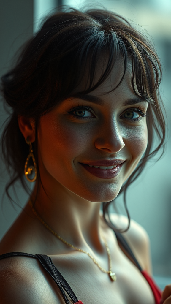 A 30-year-old, rawboned woman with a cheeky smile, captured in the style of a Cinematic film still. The image is inspired by the works of Mark Citret, Guillermo Espinosa, Carl Frederik von Breda, Ed Benedict, Sebastian Errazuriz, and Colin Campbell Cooper, embracing a steampunk aesthetic with carefully considered negative space. It features color grading and presents an analog style with hyper-realistic UHD faces and 8k resolution. The photo, taken with a DSLR, utilizes soft, high-quality lighting with film grain, reminiscent of a Fujifilm XT3 and Olympus XA2 Camera setup with a 50mm lens at F/2.8. Highlights include HDR effects, realistic textures, and volumetric lighting mingling with a gentle fog to produce a moist atmosphere with a shallow depth of field, amplifying the reflections. Absurdly high resolution captures the essence of a fashion shot with psychedelic influences and a Thomson MO5 color palette, all within a Modular constructivism framework. The composition maintains a cinematic editorial vibe, showcasing pretty hands and an overall realistic and timeless editorial cover art feel.
