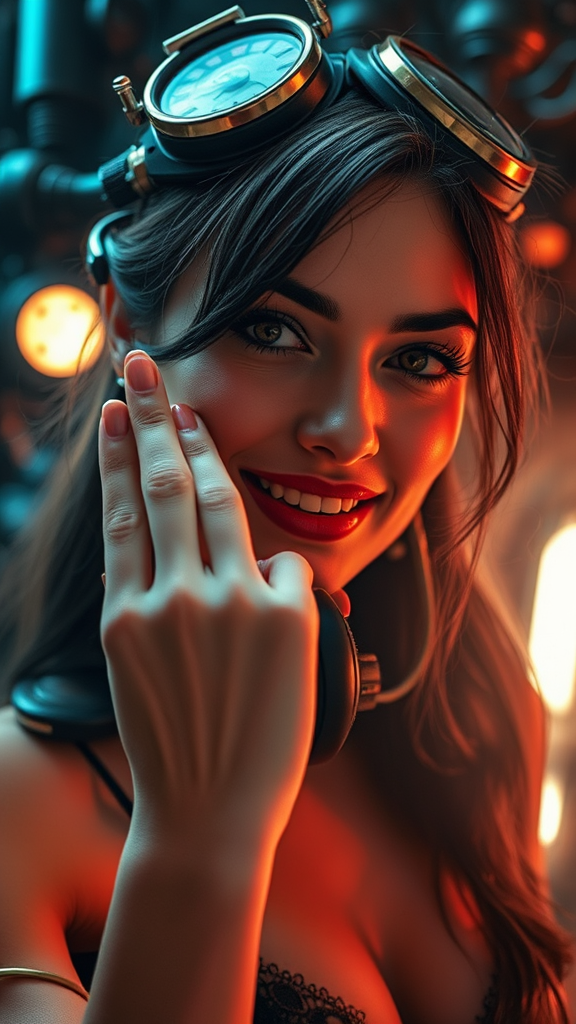 A 30-year-old rawboned woman, with a cheeky smile, captured in a steampunk-inspired setting. Influenced by artists like Mark Citret, Guillermo Espinosa, Carl Frederik von Breda, and others, the image presents a cinematic film still in an analog style. The composition is hyper-realistic, in 8k UHD, with high-quality features and soft lighting that adds depth through volumetric lighting and fog. Taken with a Fujifilm XT3 and an Olympus XA2 Camera using a 50mm lens at F/2.8, the photograph boasts film grain, HDR, and color grading that emphasize its editorial cover art appeal. The psychedelic, modular constructivism elements are balanced with realistic attributes, focusing on the woman's pretty hand and captivating expression. Avoiding distractions like logos or watermarks, the image maintains clarity and focus, depicting a dynamic yet coherent fashion shot.