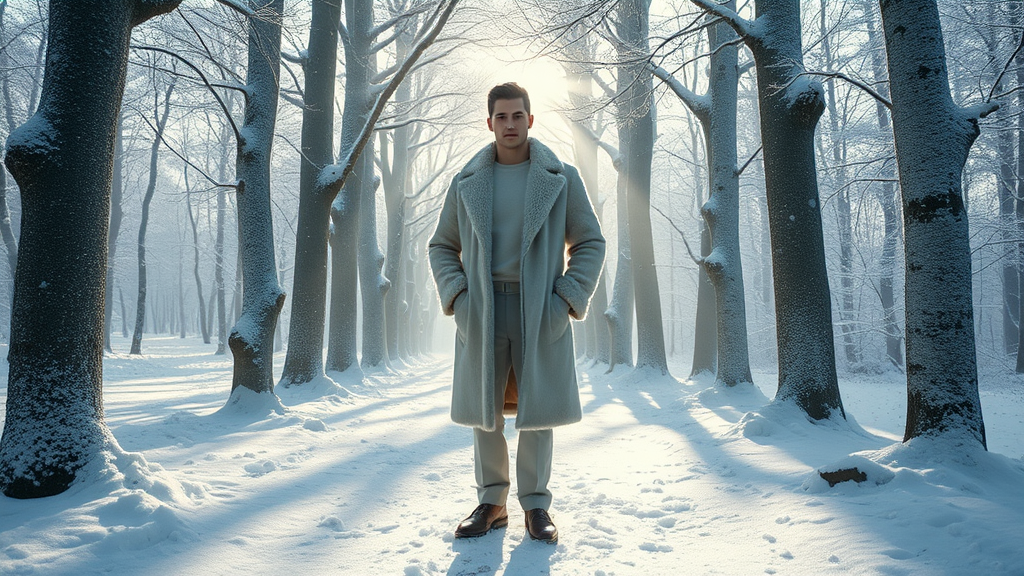 A 30-year-old realistic man, standing at 5'8", is enveloped in a tranquil forest shrouded in snow, enclosed by towering trees draped in soft white. The ground sparkles with fresh snowflakes, and the air is crisp and tranquil. Gleaming mirrors encircle him, capturing his reflection from every angle, creating a dreamlike and enchanting ambiance. He is clad in an opulent ivory fur long coat and matching trousers, seamlessly blending with the wintry landscape. Gentle sunlight filters through the branches, casting a warm glow over the scene, enhancing the magical winter allure.