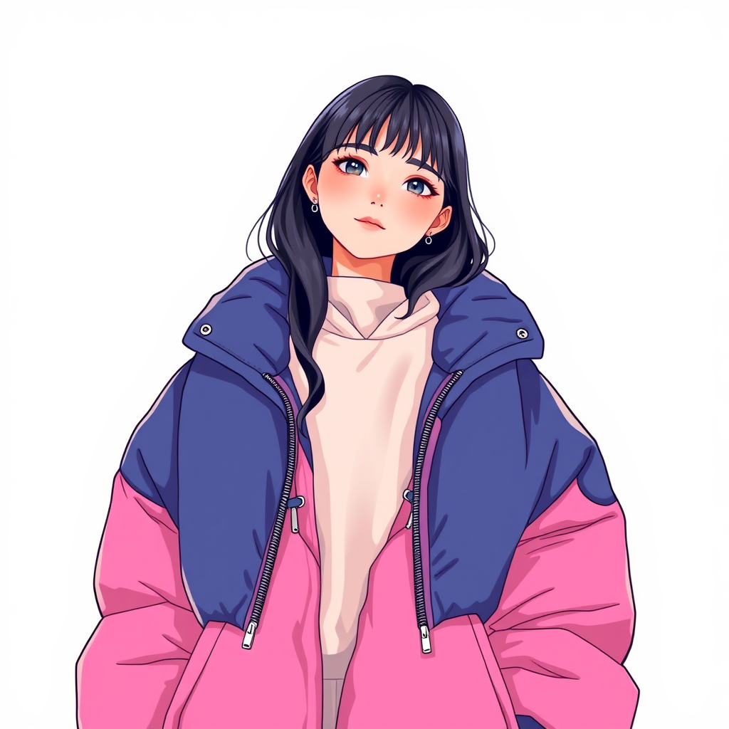 A 30-year-old woman in an oversized puffer poncho jacket inspired by OffWhite and Yanjun Cheng, blends Tumblr aesthetics with the iconic lofi girl internet meme. Trending on Dezeen, this catalog-style digital artwork incorporates elements from Beeple, Rhads, and Lois van Baarle. It features a cartoon-style illustration with bright pastel colors, reminiscent of retro anime, capturing the essence of a beautifully modern and nostalgic piece.