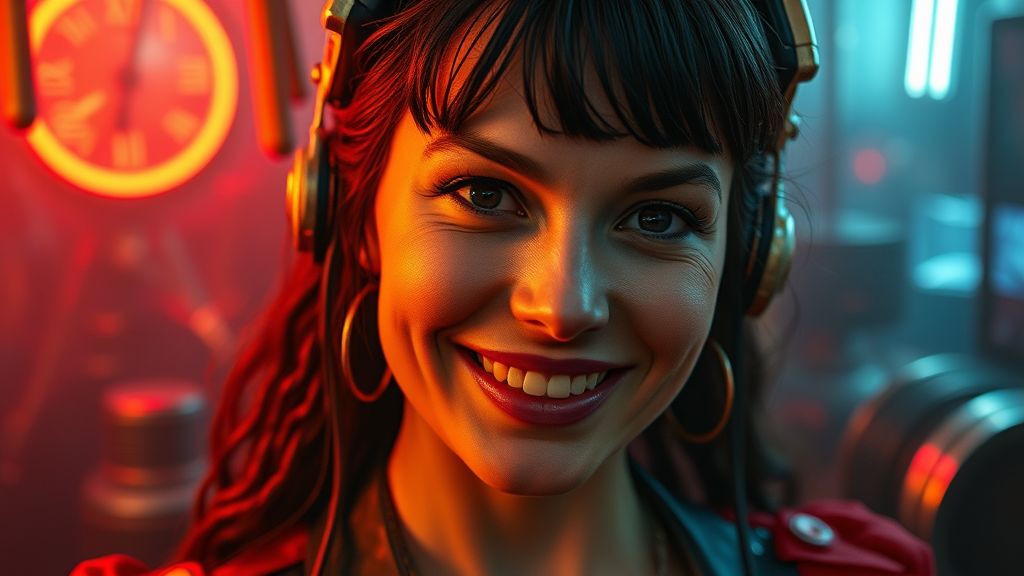 A 30-year-old woman with a rawboned build, sporting a cheeky smile, inspired by the works of Mark Citret, Guillermo Espinosa, Carl Frederik von Breda, Ed Benedict, Sebastian Errazuriz, and Colin Campbell Cooper. Set in a steampunk world, the scene features negative space and is color-graded to resemble a cinematic film still, embodying an analog style with hyper-realistic UHD faces in 8k resolution. Captured with a Fujifilm XT3 and Olympus XA2 camera using a 50mm lens at F/2.8, it boasts HDR effects, realistic color grading, and atmospheric volumetric lighting and fog. Reflections abound, serving as a fashion shot with a psychedelic twist, employing a Thomson MO5 color palette and modular constructivism design. Showcasing cinematic composition suitable for editorial cover art, this high-quality image embraces film grain and soft lighting for a hyper-realistic portrayal. The scene is lively yet meticulously crafted to avoid elements like cartoons, logos, or typical flaws such as low quality, distortion, or unrealistic proportions. The woman's hands are artistically rendered, emphasizing realistic anatomy while maintaining the overall thematic essence.
