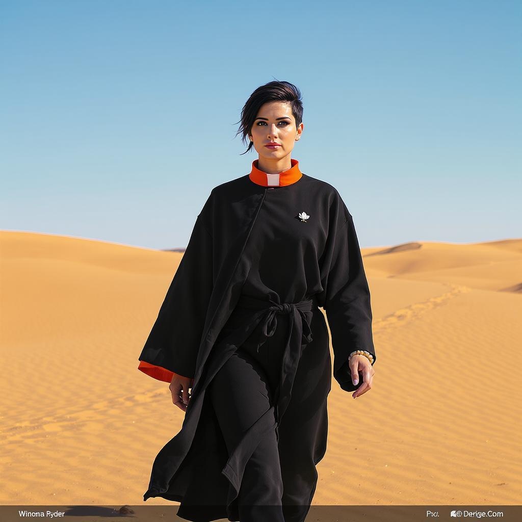 A 32-year-old woman resembling Winona Ryder serves as the visionary guide of a hybrid Christian-Buddhist religion, her confident demeanor accentuated by a short, edgy pixie cut of jet-black hair. She wears a flowing black robe adorned with a subtle white lotus blossom pin on the lapel, signifying purity and enlightenment. Her ensemble is made modern by a vivid orange clerical collar, contrasting with sleek matte black yoga pants that hint at her pragmatic approach. Her light makeup highlights her natural features, with no jewelry except for a humble double-strand of small wooden beads wrapping her left wrist. As she strides purposefully toward the viewer, the Nubian sand desert stretches behind her, an ocean of golden waves under a vast, cloudless blue sky, each step marking her path as a bridge between spirituality and the earthly realm.