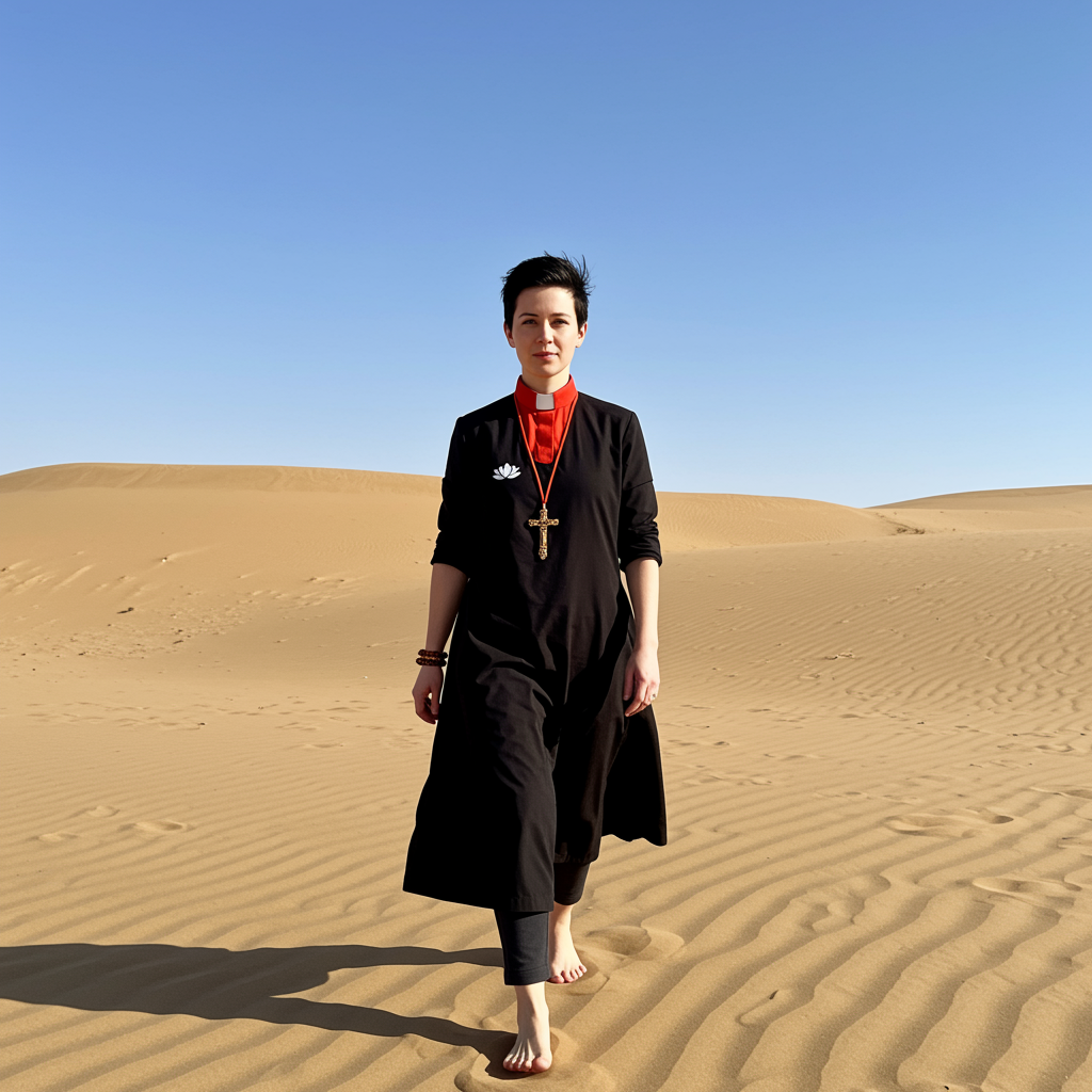 A 32-year-old woman who bears a striking resemblance to Winona Ryder strides confidently towards the viewer. Her presence is both serene and commanding, embodying the essence of a new fusion of Christian and Buddhist beliefs. Her sleek pixie cut frames her face, the black hair contrasting sharply with her bright orange clerical collar that denotes her spiritual role. She wears a flowing black robe that billows slightly in the desert breeze, a tiny white lotus pin gleaming subtly on her lapel. The matte black fabric of her yoga pants catches the sunlight, emphasizing her graceful, purposeful movement. Her face is lightly touched by makeup, enough to highlight her natural features, yet devoid of jewelry as a statement of simplicity. Around her left wrist, a double-strand of small wooden beads reflects her commitment to mindfulness. She traverses the vast Nubian sand desert, each step a mark of resilience against the backdrop of an endless, deep blue sky.