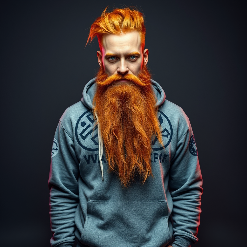 A 35-year-old man exudes cyberpunk aesthetics in a photorealistic 16k image. His fiery ginger hair is styled rebelliously, standing out against a monochrome backdrop. His long, meticulously groomed ginger beard is captured in exquisite detail, highlighting his precise nature. He wears a grey hoodie featuring cryptic symbols and neon accents alongside rugged indigo jeans. His piercing blue eyes and a wry smile form the focal points of his intriguing persona. Captured with a Canon EOS 5D Mark IV and an EF 24-70mm f/2.8L II USM lens, the image employs dramatic lighting to create high contrast, accentuating his features and attire. The vibrant color palette emphasizes blues, greys, and the vibrant ginger of his hair and beard. The man stands centrally in the composition, looking directly into the camera for a full-body shot. Small creative modifications subtly enhance the core concept.