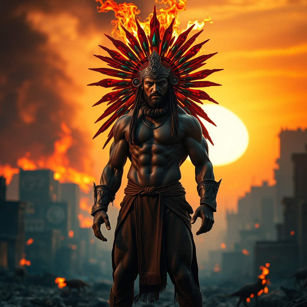 A 35-year-old man stands in the midst of a burning city as the sun sets, casting dramatic lighting over the scene. The hyper-realistic and finely detailed figure features a muscular, savage appearance, exuding a dark, ancient era aesthetic. His head, face, torso, arms, hands, legs, and feet are meticulously detailed, showcasing his brutal strength. He wears an epic, majestic headdress ablaze with fire, made from large, otherworldly elements. The warm, vibrant colors of the sunset—orange, red, and turquoise—complement the headdress and create a fiery halo around him. The scene is a vivid tapestry of colors that echo the warmth and passion of a sunset, with the burning city forming the dramatic backdrop for this powerful, thematic portrayal.