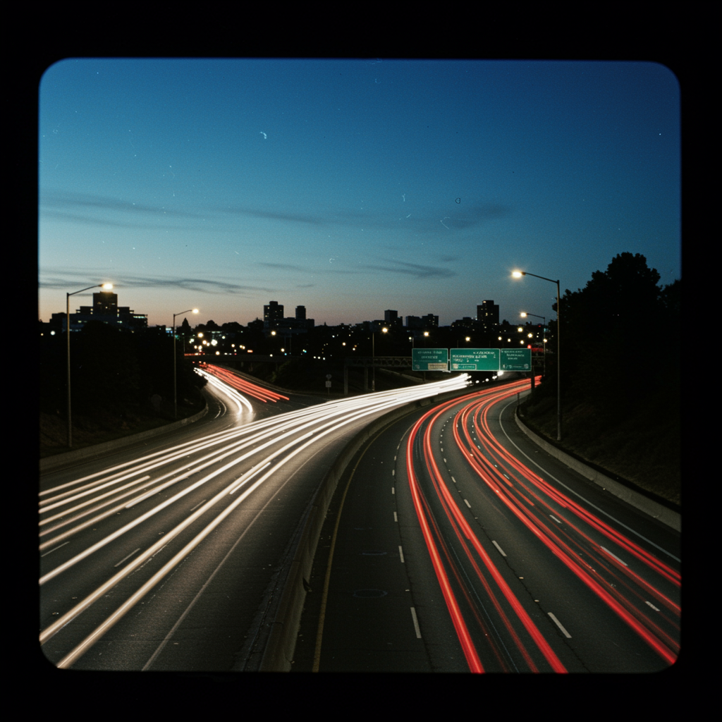 A 35mm film photo taken from an overpass, capturing the stream of blurred headlights and taillights as they streak beneath the dusky sky of blue hour, the scene imbued with a grainy texture that adds to its cinematic allure, the faint outlines of distant city buildings softly framing the vibrant motion below.