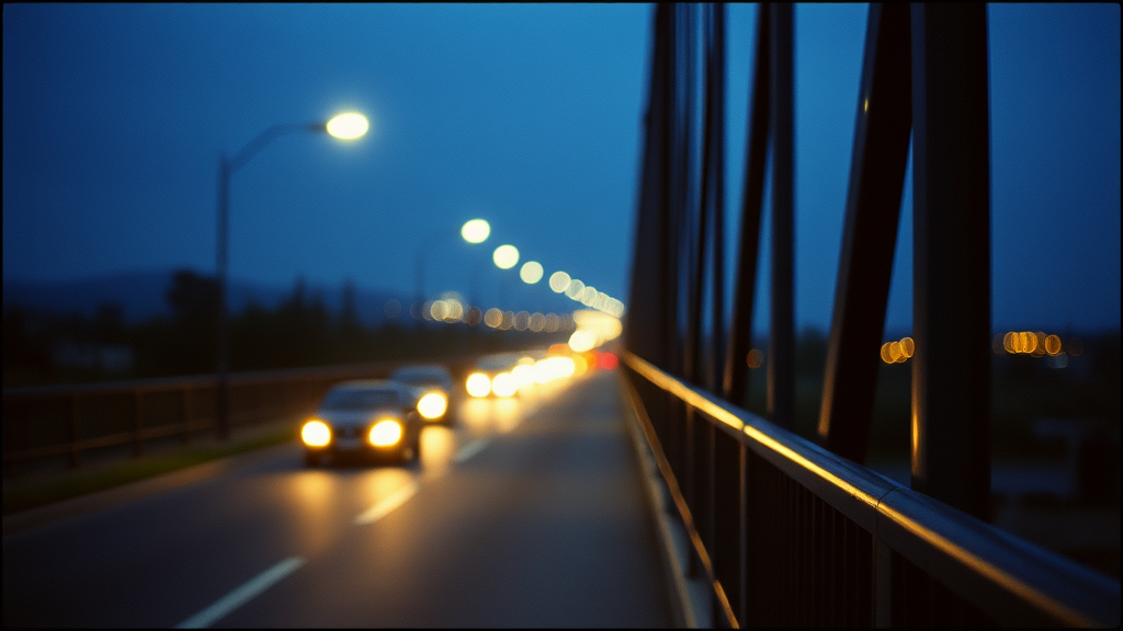 A 35mm film photograph taken from a quiet pedestrian bridge, showcasing the blurred motion of car lights beneath, captured during the enchanting blue twilight. The image is grainy, exuding a nostalgic cinematic quality, with hues of deep indigo blending into soft pops of artificial street and headlamp glow, adding an ethereal atmosphere reminiscent of an atmospheric vintage movie scene.