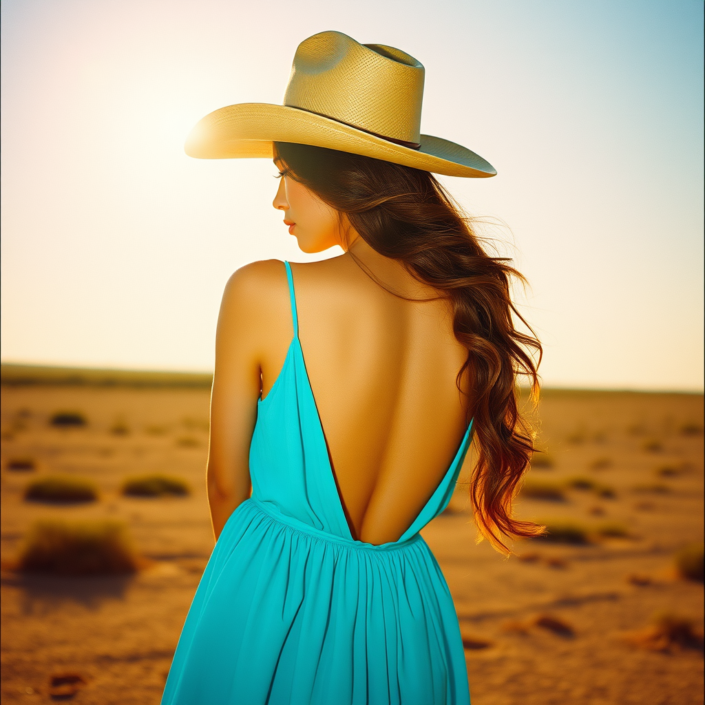 A 35mm photograph captures a woman in a cyan-blue sun dress with an open back, topped with a cowboy hat. The vibrant sun-drenched scene evokes the lively essence of Rex Orange County's music, with a color palette dominated by warm orange and calming cyan hues. The woman's poised posture reveals her elegantly exposed back, reminiscent of an Ana de Armas portrait, while hints of artistic influence from Maxwell Boas and Jenny Saville are evident. Set against the wide-open Texas skies and the beating sun, the photo resonates with the summer vibrance of the year 2020. Despite its low resolution, this analog photograph, possibly taken by Lily Frank in San Francisco, beautifully showcases a blend of azure and rich red tones. With an aperture of f/2, the image embraces soft focus and photo grain, adding depth to this Tumblr-style portrait.