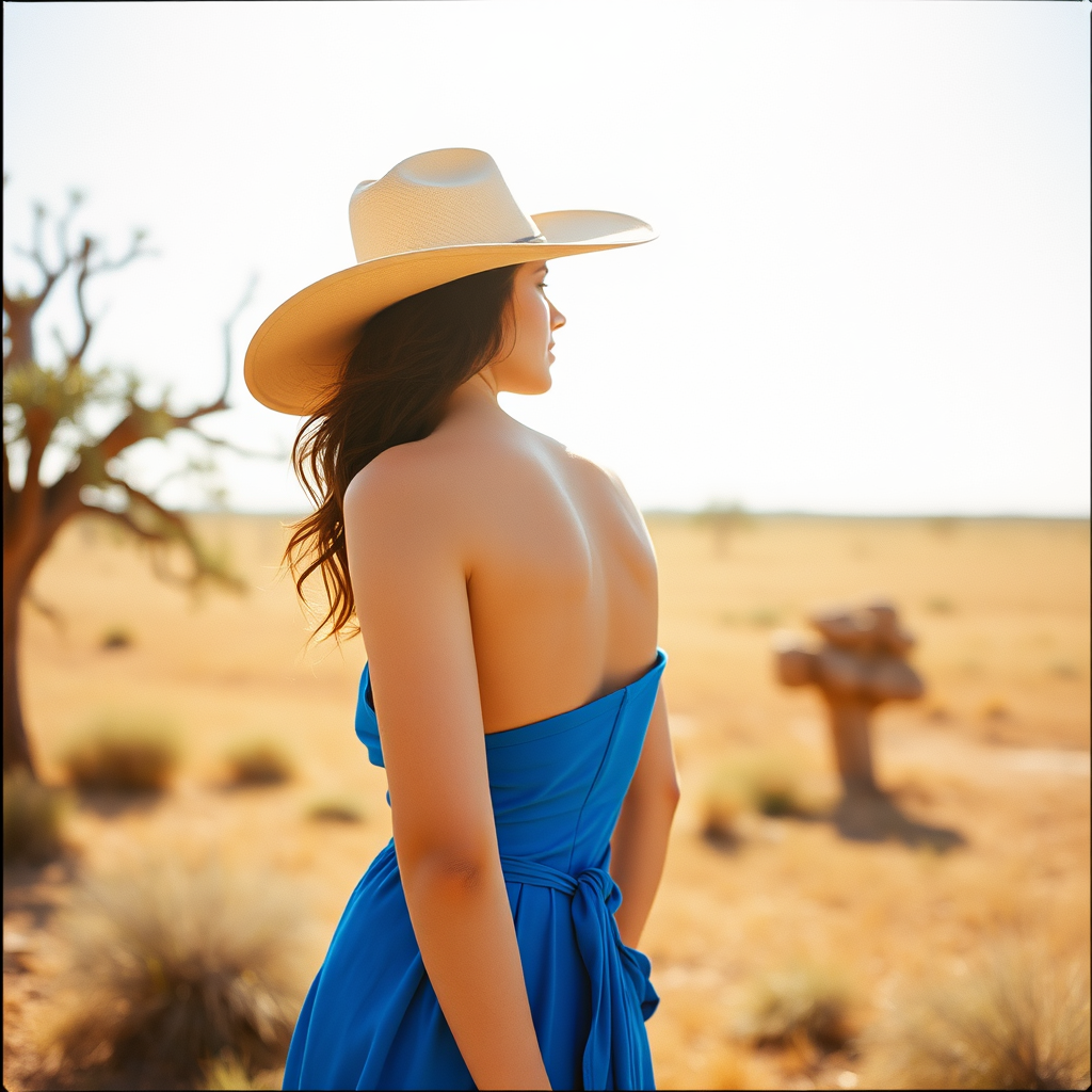 A 35mm photograph captures a woman in a striking blue dress and cowboy hat, against the sun-drenched backdrop of a Texas landscape. The image echoes the vibrant, eclectic style found on Tumblr, possibly channeling the artistic essence of Nathalie Rattner. Akin to a Rex Orange County melody, the portrait reveals her elegantly exposed back, bathed in a palette of cyan and orange hues that harmonize with the summer of 2020. The serene composition parallels Ana de Armas’ grace, touched by the artistic influences of Maxwell Boas and Jenny Saville. The photograph, while low in resolution, shines with the azure skies and hints of red reminiscent of a Lily Frank shot in San Francisco. The analog photo, with its distinctive grain, was captured at an aperture of f/2 to embrace the warm, vibrant essence of the scene.