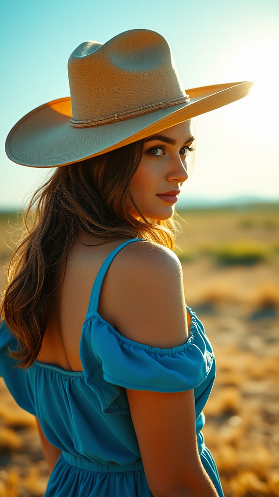 A 35mm photograph captures a woman in a vibrant blue dress and a classic cowboy hat, her back gracefully exposed to the glowing midday sun. The scene evokes a nostalgic charm reminiscent of Tumblr's artistic style, possibly influenced by Nathalie Rattner's imaginative strokes. Bathed in a dreamy cyan and orange palette, the portrait reflects the upbeat yet introspective essence of Rex Orange County's music. Her expression, an intriguing blend of mystery and allure, hints at the enigmatic qualities often seen in Ana de Armas's portraits. Crafted with inspiration from artists like Maxwell Boas and Jenny Saville, the setting appears to be a sun-drenched Texan landscape, capturing the essence of a bygone summer in 2020. Despite its low-resolution graininess, the photograph radiates vibrancy, weaving azure and red tones into its fabric. It could have been taken amidst the creative bustle of San Francisco by the keen eye of Lily Frank, employing an f/2 aperture to envelop the subject in a soft, compelling blur. The analog charm of the image, peppered with delicate photo grain, immerses the viewer into its rich, summery tapestry.