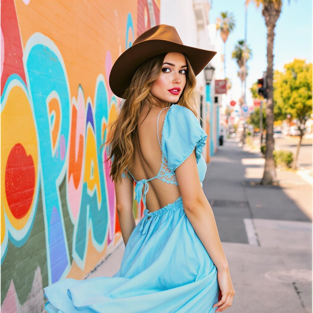 A 35mm photograph captures a woman in an open-back blue sundress paired with a cowboy hat. The dress, a quintessential sundress, showcases an elegantly exposed back, bringing a touch of summer allure. This image, possibly a creation reminiscent of Nathalie Rattner's Tumblr style, finds inspiration in the music of Rex Orange County, with a color palette dominated by vibrant cyan and warm orange. The portrait channels the essence of an Ana de Armas likeness, while hints of influence from artists like Maxwell Boas and Jenny Saville emerge in the intricate detailing. Set under the blazing Texas sun, the scene is bathed in a warm glow, perhaps situated in a vibrant San Francisco. The photograph captures summer's vibrant energy reminiscent of the year 2020. The azure and red tones interweave beautifully as the f/2 aperture creates a dreamy depth, with analog photo grain adding texture.