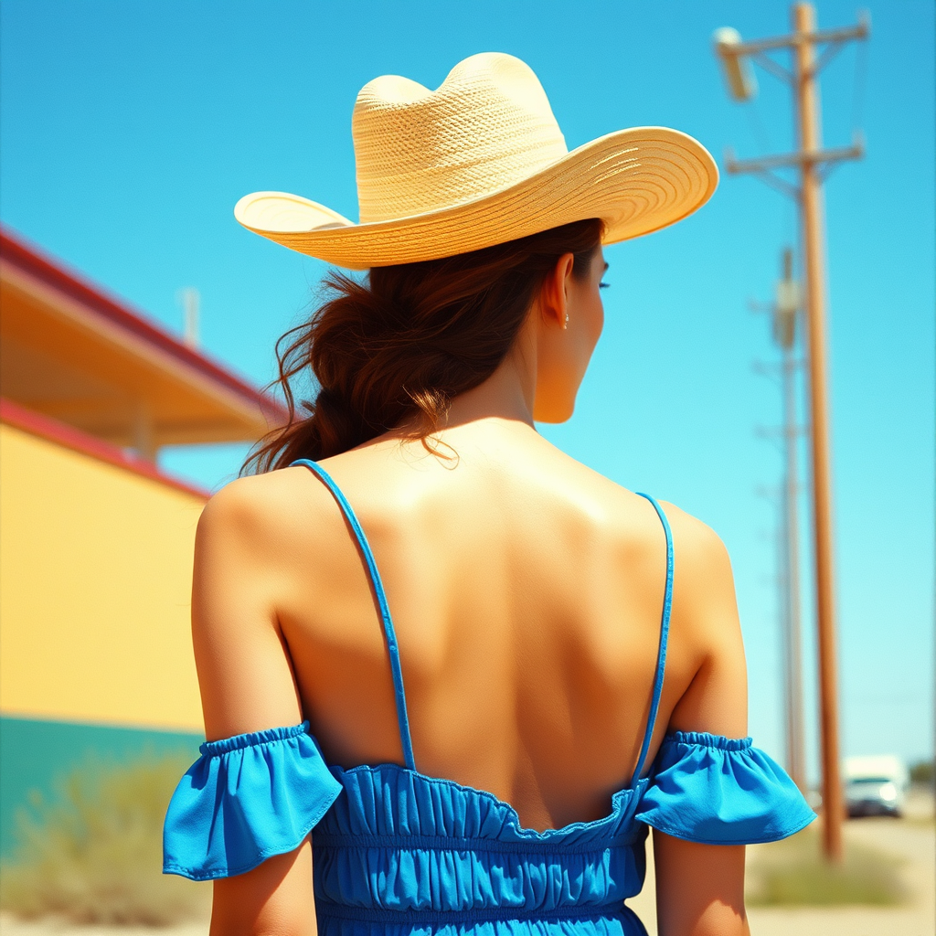 A 35mm photograph of a woman in a blue dress and cowboy hat, possibly taken by Nathalie Rattner, embodies a Tumblr aesthetic. The scene carries inspirations from Rex Orange County's music and showcases an exposed back, drenched in a cyan and orange color palette. Resembling an Ana de Armas portrait, it suggests influences from artists like Maxwell Boas and Jenny Saville. Set under the Texan sun, the image captures a 2020 summer vibrance, with the possibility of being shot in San Francisco by Lily Frank in azure and red tones. The picture, with its low resolution and nostalgic photo grain, was taken at an aperture of f/2, encapsulating a sense of warm and vibrant analog imagery.