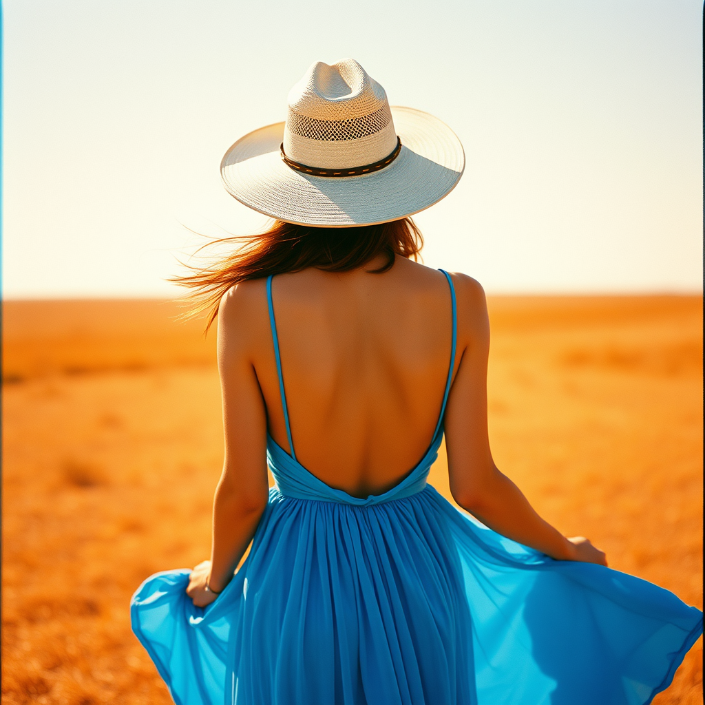 A 35mm photograph of a woman in a flowing blue dress and a cowboy hat, with an exposed back, set against the vibrant sunlight of a Texas landscape. The images' essence carries the laid-back and reflective tone of Rex Orange County's music, with a color palette dominated by rich cyan and vibrant orange, creating a striking contrast of azure and deep red hues. The style suggests an Ana de Armas-like portrait, infused with influences from artists such as Maxwell Boas and Jenny Saville, presenting a raw yet polished piece. The photograph, possibly taken by Lily Frank in San Francisco, exudes a Tumblr aesthetic, encapsulating the ethereal summer of 2020. The photo, set at an aperture of f/2, has an analog, grainy quality that resonates with nostalgia while maintaining the sun-soaked vibrancy, potentially evoking connections to an artwork by Nathalie Rattner despite its intentionally low resolution.