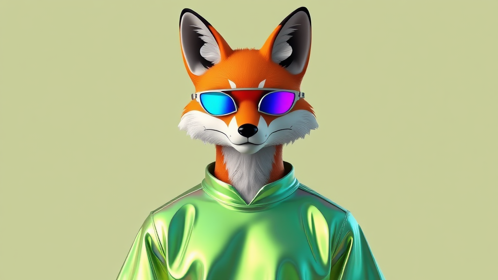 A 3D cartoon fox head with a humanoid body, wearing an iridescent holographic liquid-textured, translucent material sun protective shirt, exuding a boss-like attitude. The shirt features either Nike or Adidas sun protection, with a WitchPunk twist and a Y2K style influence, predominantly green and blue hues with a metallic feel and strong reflection. The background is a pure single color, emphasizing digital fashion and surreal futurism. The portrait captures the essence of a Supreme Kong NFT artwork style blended with the Disney style and headshot photography, ideal for a fashion editorial aesthetic. The style aligns with high-resolution HAPE PRIME NFT and Bored Ape Yacht Club project vibes, showcasing ultra-detailed 3D render quality, oc render, fine luster, 8K resolution, bright front lighting, and a sharp face shot, maintaining high detail and vibrant visuals.