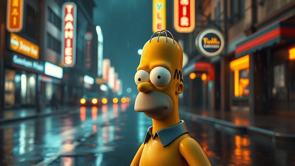 A 3D cartoon rendition of Homer Simpson stands solemnly in an abandoned street of a dark, rainy dystopian city. Neon lights flicker in the background, casting vibrant reflections on the wet pavement. The atmosphere is cinematic and moody, reminiscent of Blade Runner's iconic tones. Raindrops cascade onto Homer’s head, highlighting the hyper-realistic texture of his character. Despite the gloomy setting, a faint, surreal glow envelops Homer, adding an unexpected warmth to the scene. Ultra 4k resolution captures every detail, from the glistening raindrops to the intricate neon patterns.