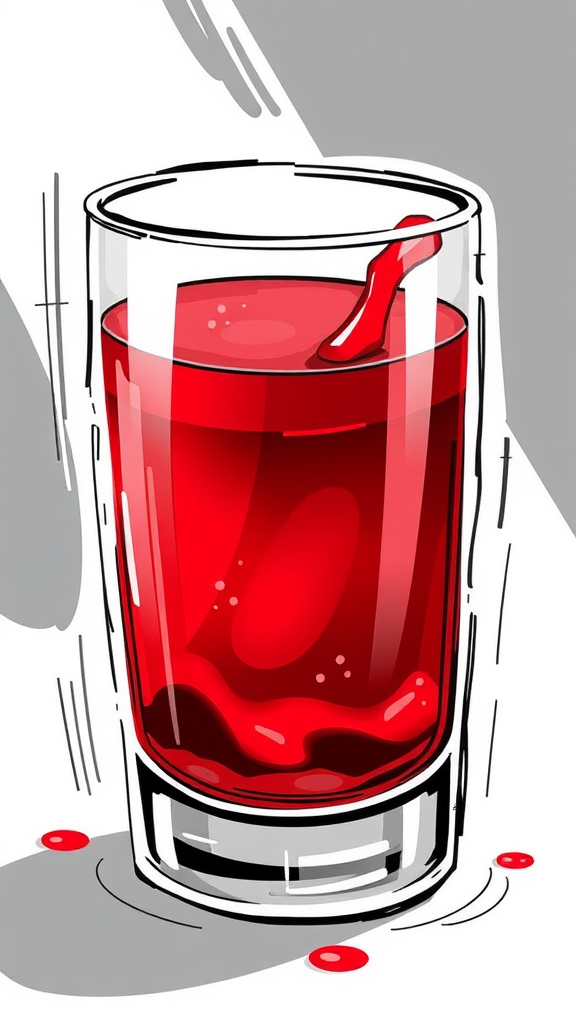 A 3D cartoon-style glass filled with a vibrant, crimson liquid resembling blood, surrounded by anime-inspired sketch lines, featuring a slightly exaggerated, playful art style with a touch of low-resolution charm, capturing a whimsical yet eerie atmosphere.